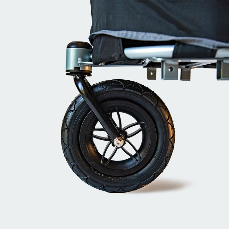 - Rubber all terrain wheels offer a cushioned ride and never go flat