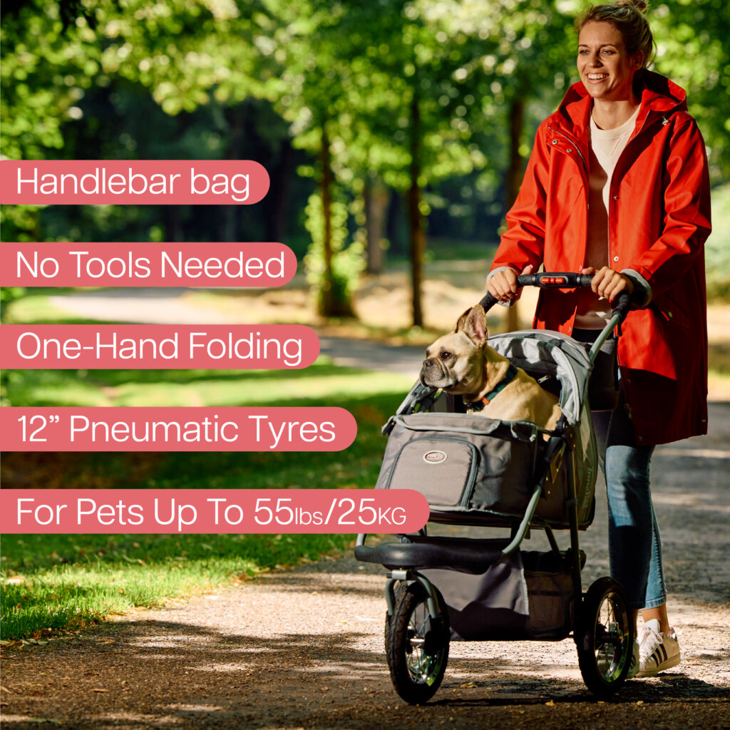Maximum comfort thanks to the large pneumatic tyres, a spacious lying surface, strong fastening lines and lots of ventilation. The pram can handle a weight up to maximum 25 kilos. Are you on the road or don’t you use the pram for a while, you can fold it with just one hand and store it compactly. Quality and comfort for you and your pet.