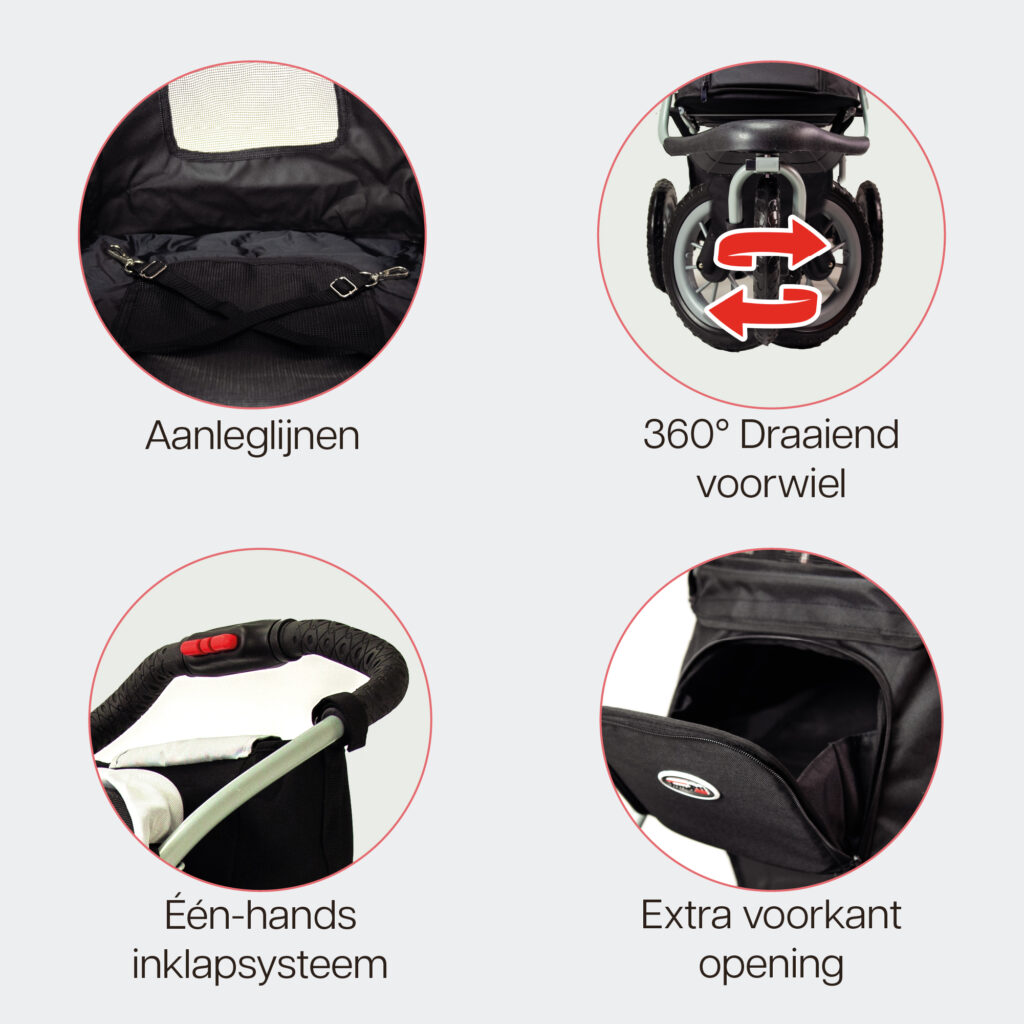 Gemak, dat is wat onze producten zo bijzonder maakt. Je kan de stopwatch er op gelijk zetten en binnen 5 minuten is jouw hondenbuggy gebruiksklaar.
